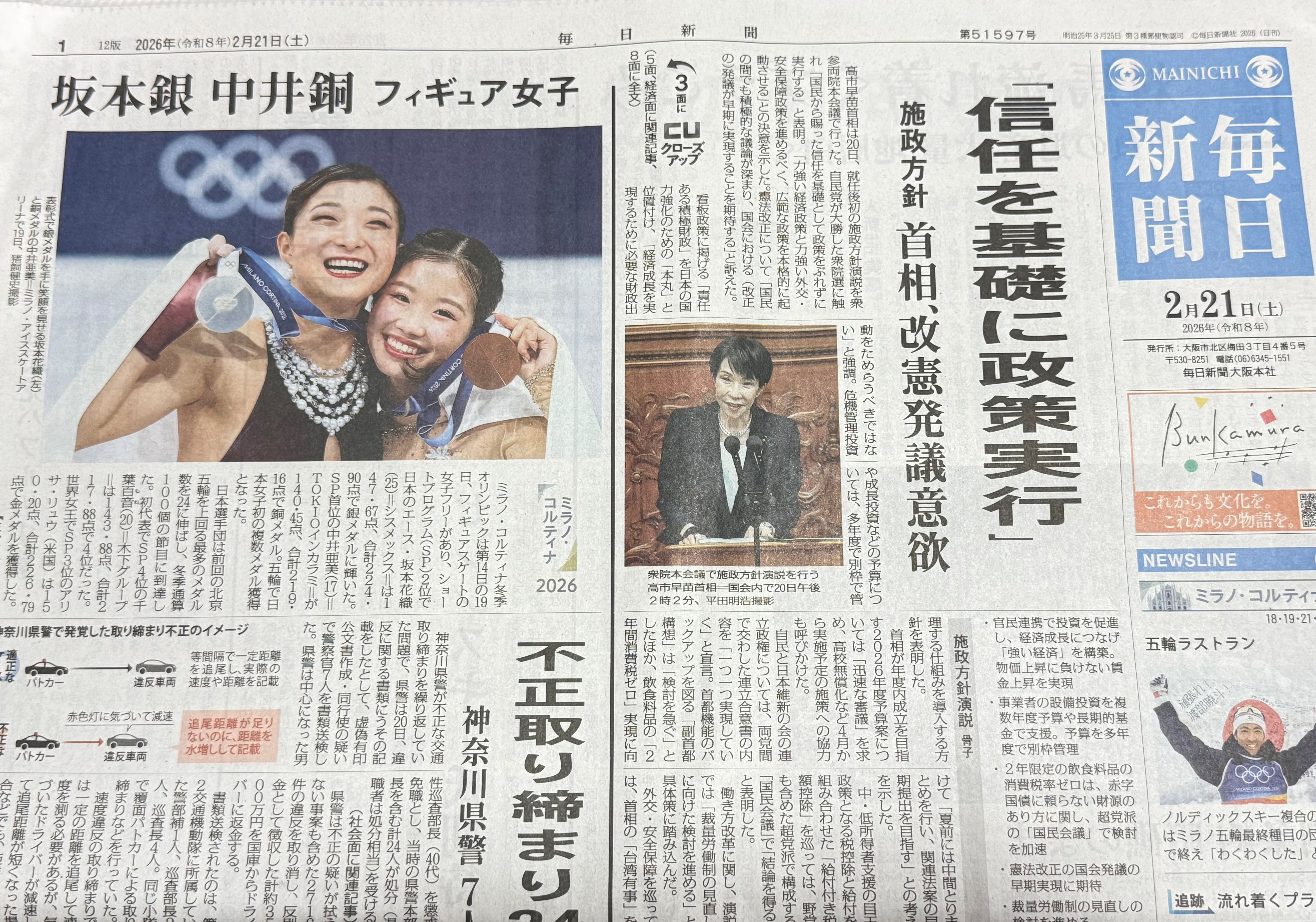 最新ニュースが満載! 毎日新聞の2026年2月21日号は、国内外の重要な出来事が詰まった一冊です。