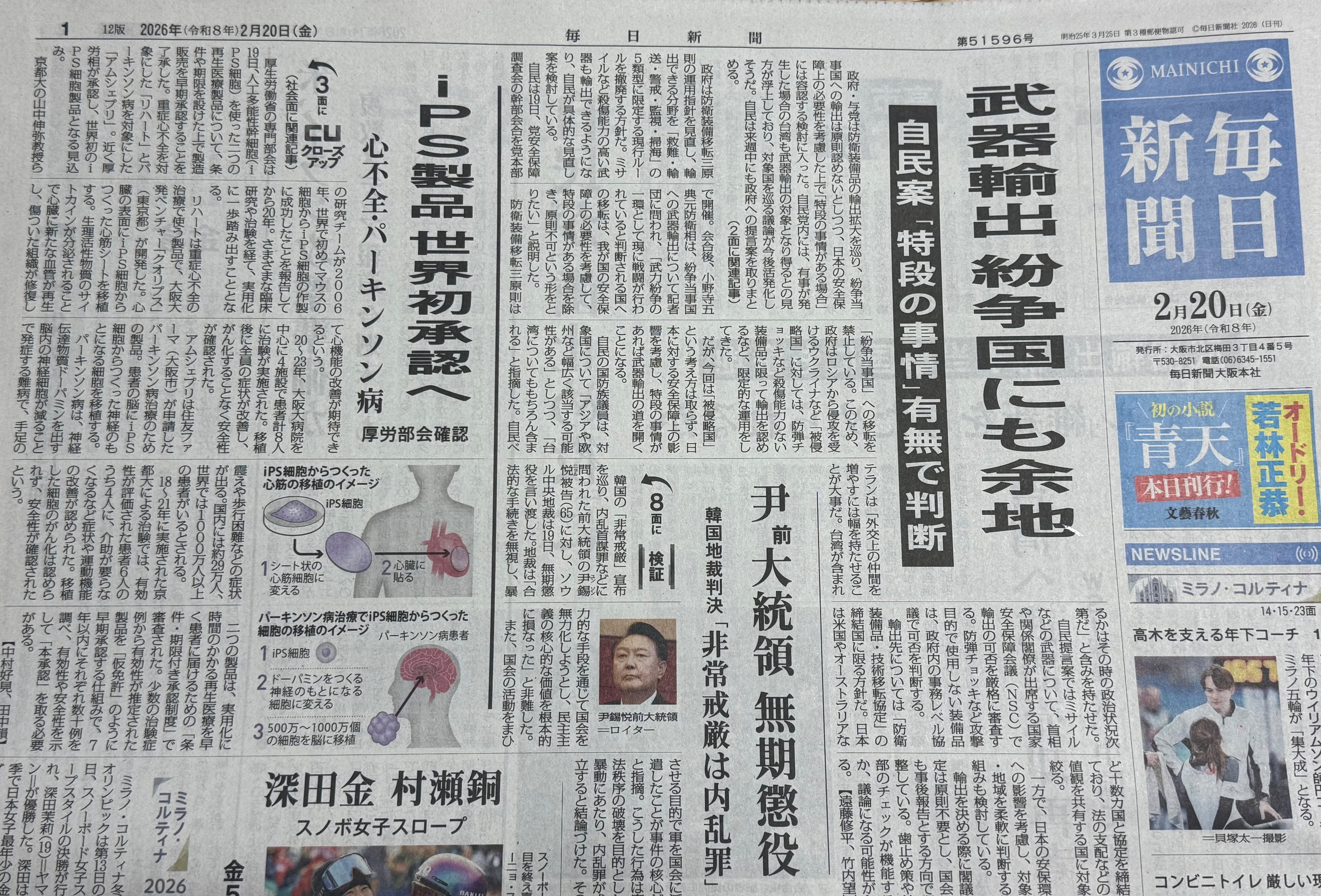 毎日新聞 2026年2月20日 未使用過去新聞紙