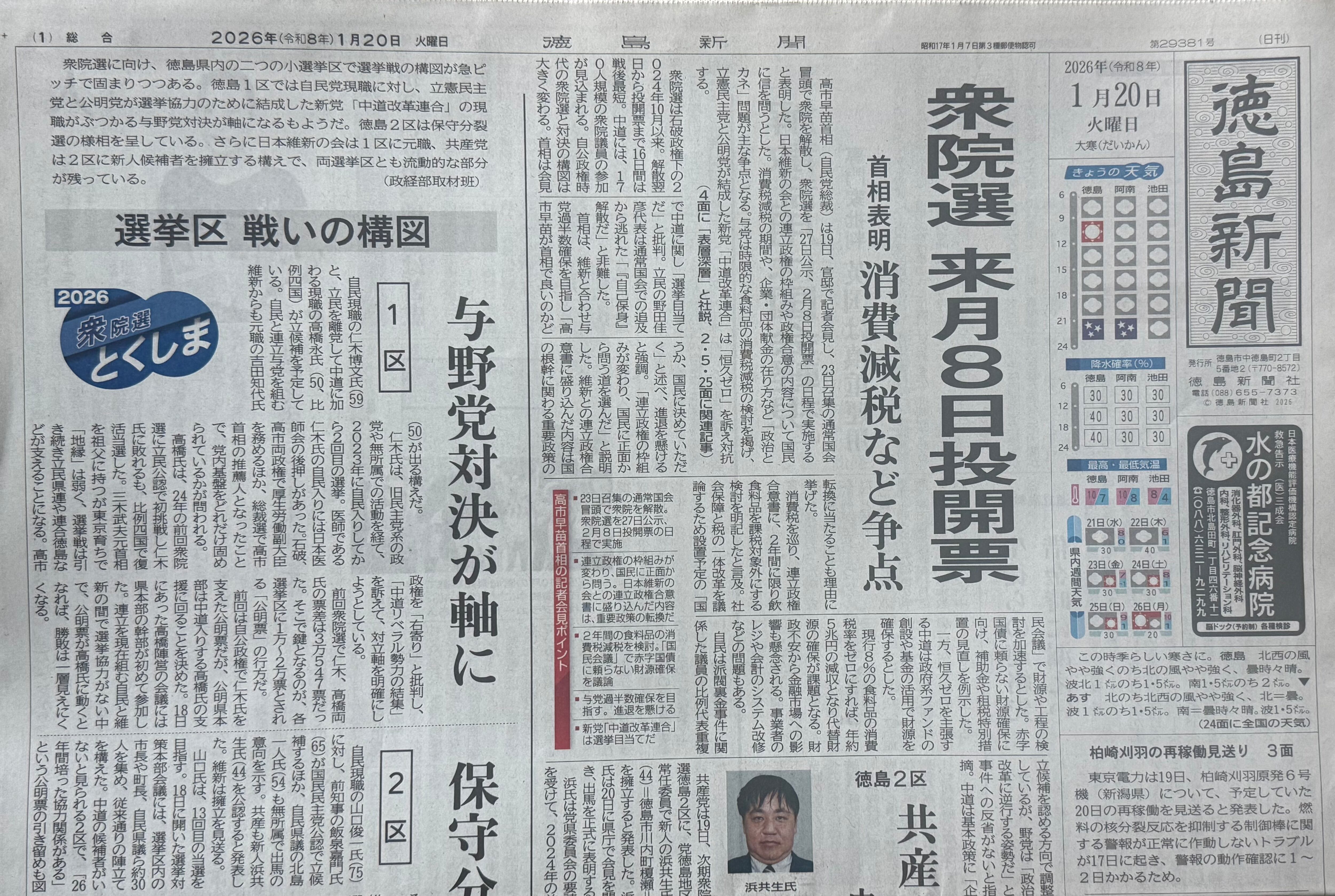 徳島新聞 2026年1月20日 未使用過去新聞紙